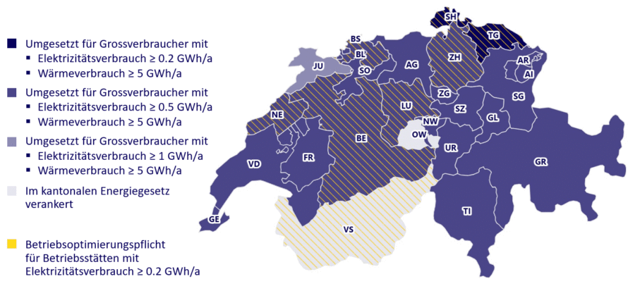 Zielvereinbarungen können sowohl auf kantonaler Ebene als auch auf nationaler Ebene abgeschlossen werden. In den meisten Kantonen gibt es Energiegesetze mit einem Grossverbraucherartikel, welcher definiert, ab wann für einen Elektrizitäts- oder Wärmeverbrauch eine Zielvereinbarung abgeschlossen werden muss. Eine Vorstufe dazu ist die Energieverbrauchsanalyse, die ebenfalls auf kantonaler Ebene geregelt ist. Das Bild zeigt eine Übersicht nach Kantonen mit den jeweiligen Schwellenwerten für Zielvereinbarungen für Elektrizitäts- und Wärmeverbrauch: