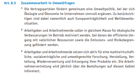 Der Grundsatzartikel 8.5 des GAV der MEM-Industrie beschreibt unter anderem, dass Arbeitgeber und Arbeitnehmende im gleichen Masse für ökologische Verbesserungen im Betrieb motiviert werden, die die Emissionsbegrenzung fördern.